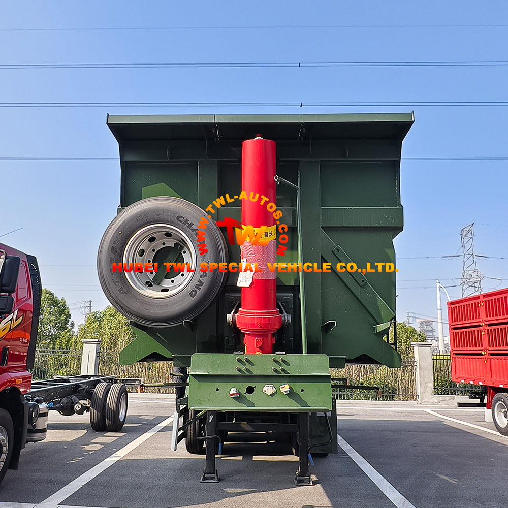 Built to withstand the rigors of construction, mining, and bulk material transport, this 45-ton rear-tipping semi-trailer combines robust structural engineering with high-performance hydraulic systems. The trailer features a heavy-duty frame constructed from high-strength steel, ensuring long-term reliability under maximum load. The tipping mechanism is driven by a HYVA hydraulic cylinder, globally recognized for its durability and smooth operation. For stability during loading and unloading, the trailer is fitted with single-action 28-ton capacity Yahua landing legs, providing a solid foundation on varied terrain. The 3-axle configuration with a robust suspension system ensures excellent load distribution and road stability, making it an ideal choice for contractors and logistics companies requiring a dependable rear-tipping solution.