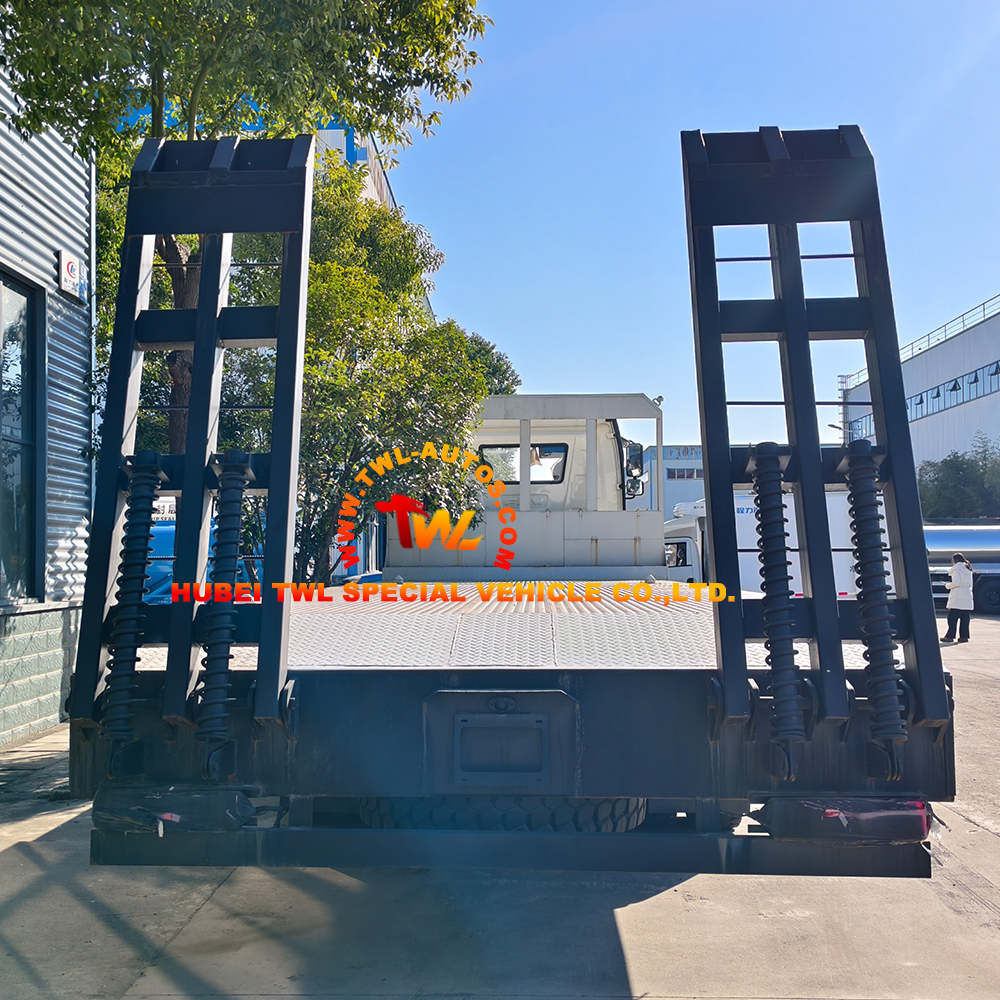 · Mechanical Ladder with Rear Support Legs: The loading system includes a mechanical ladder constructed from three steel bars with double springs, enabling easy ascent of heavy equipment onto the flatbed surface. Rear support legs provide stability during loading operations, ensuring the vehicle remains level and secure when heavy machinery is moving onto or off the platform. The independent operation eliminates the need for additional hoisting equipment.