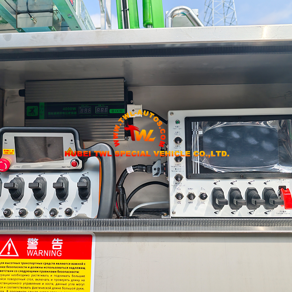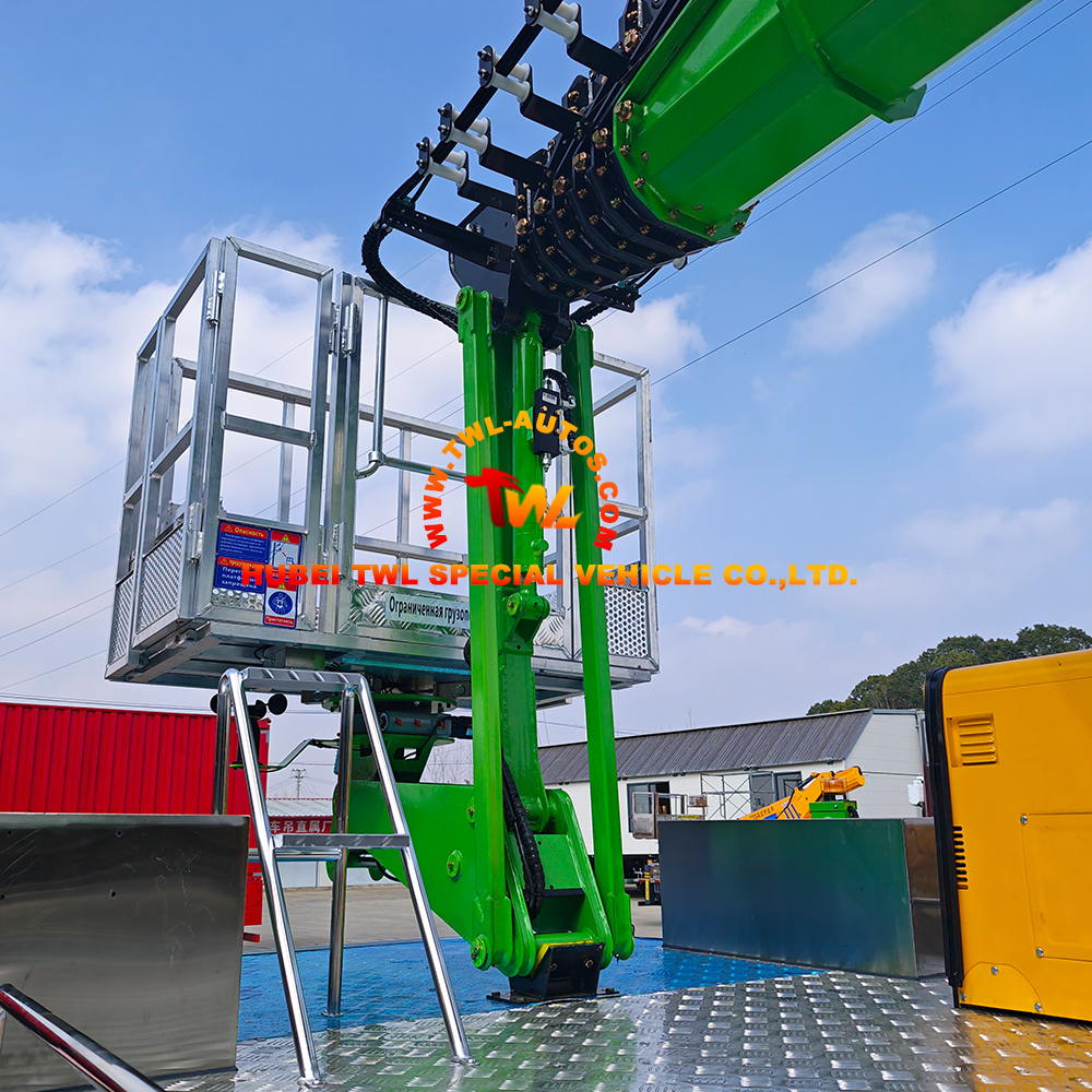 The platform includes emergency descent controls, tilt sensors, and load monitoring systems. These features ensure safe operation even at maximum boom extension or on uneven ground.