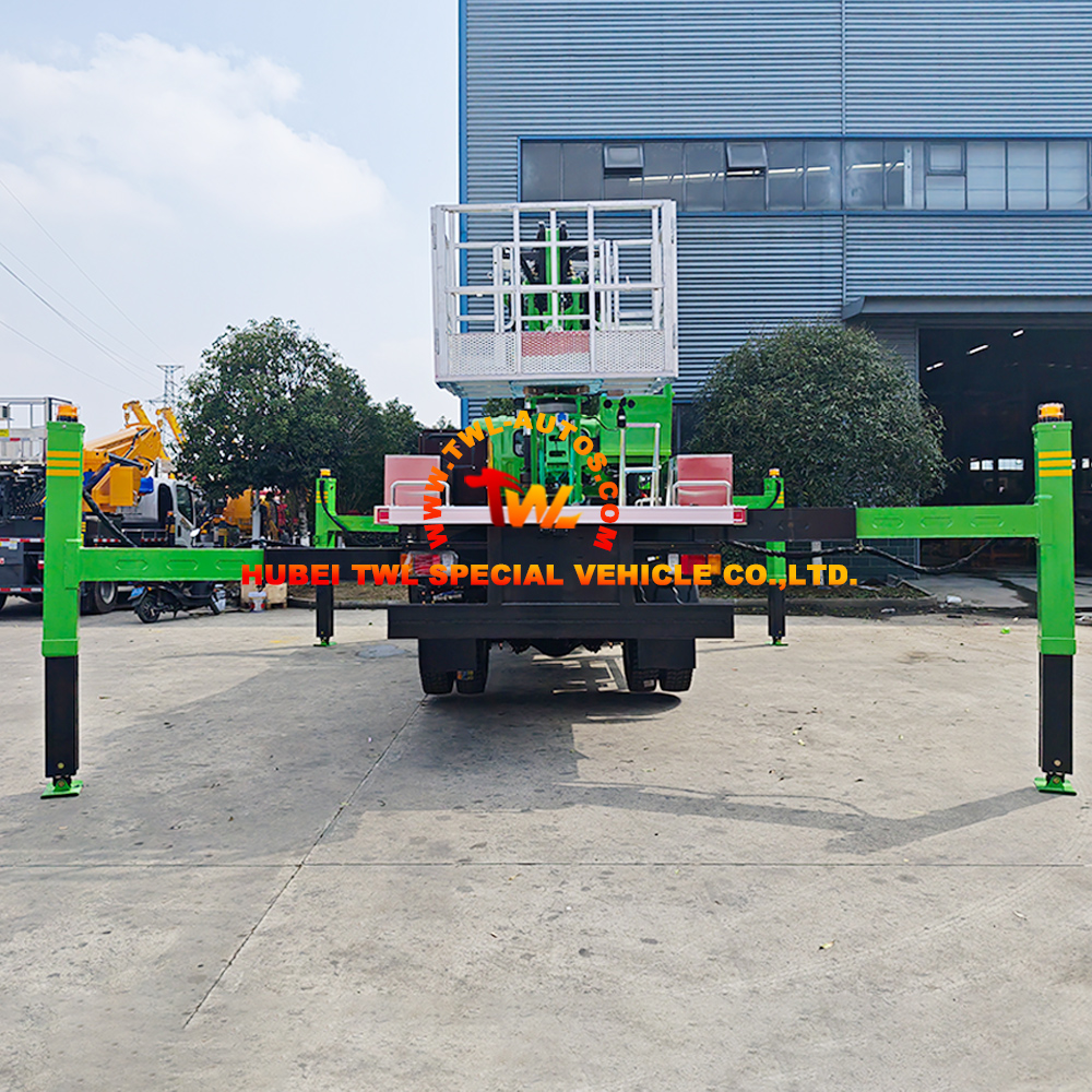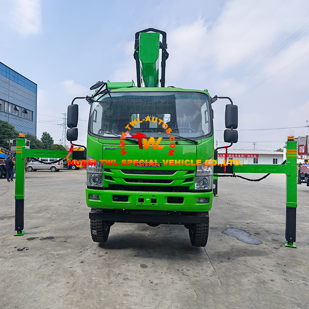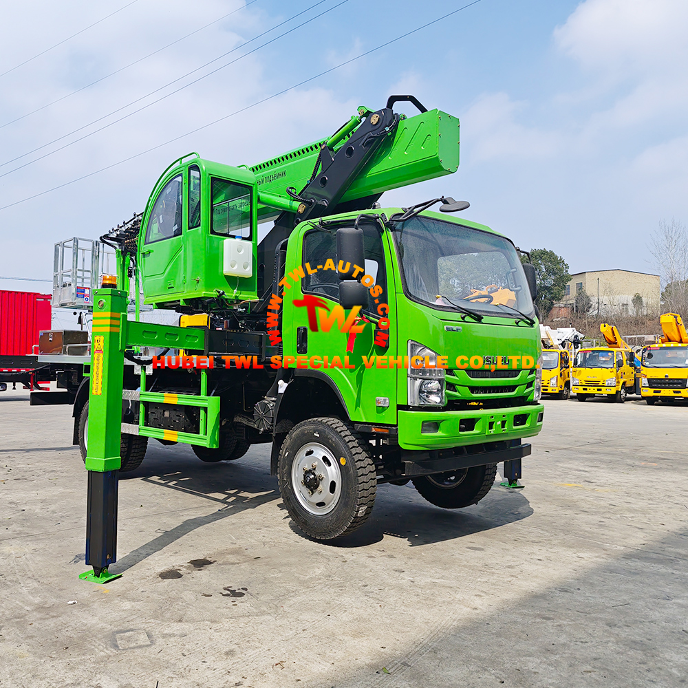 The ISUZU chassis provides the foundation for this vehicle’s go-anywhere capability. The 4×4 drive system delivers traction across muddy construction sites, uneven mountain terrain, and soft forest roads. Combined with a robust suspension and durable tires, this aerial platform can reach work sites where standard bucket trucks cannot go.