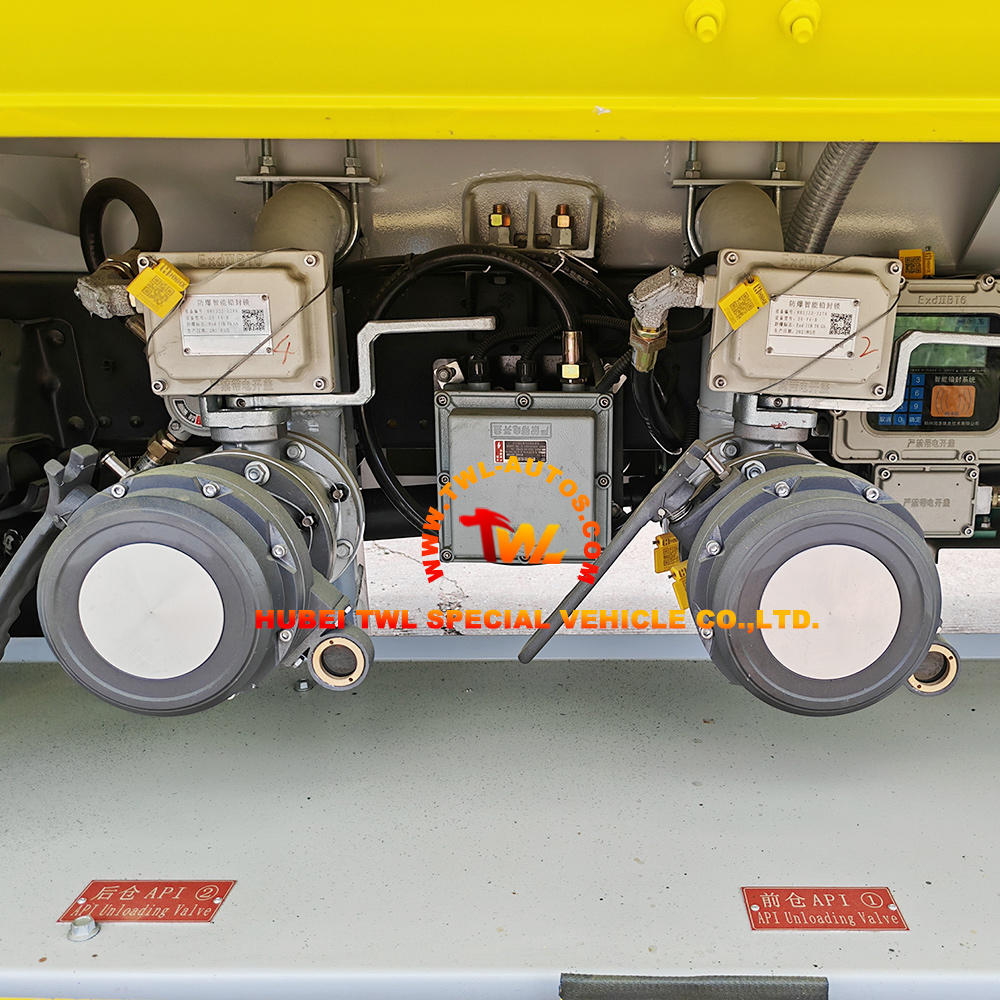 The truck features explosion-proof electrical components, emergency shutoff valves for each fuel compartment, vapor recovery systems to reduce emissions, and smart electronic seals to detect unauthorized access. An API-compliant discharging port ensures secure and regulated fuel transfer during all operations.