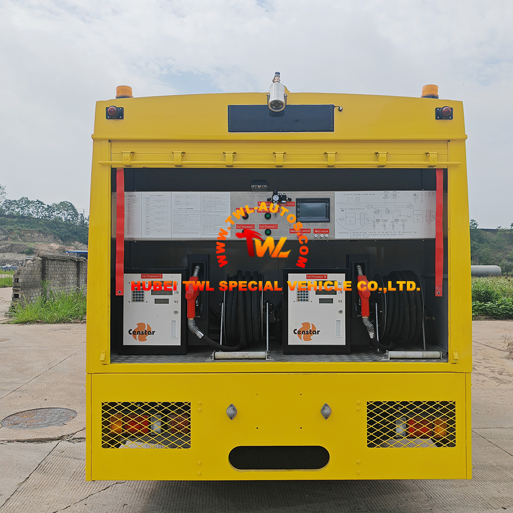 The vehicle is equipped with sealed, compartmentalized fuel tanks designed to prevent leakage and cross-contamination while meeting international fuel safety standards. Two independent Censtar fuel dispensers allow the truck to refuel two vehicles at the same time, making it ideal for fleet operations and high-frequency refueling scenarios.