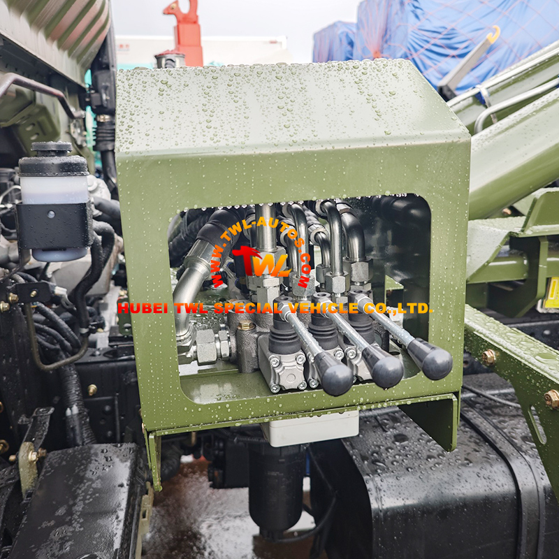 The advanced hydraulic hook arm system enables a single operator to lift, transport, unload, and exchange standardized 5m³ waste containers securely — dramatically reducing downtime and improving route efficiency. The operator can control all actions from inside the cab or via optional remote control, enhancing convenience and workplace safety.