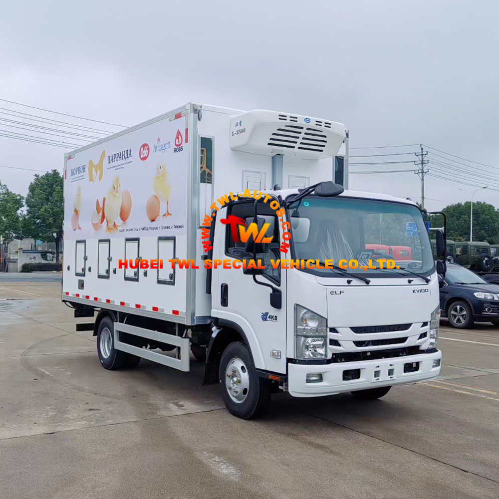 The Isuzu KV100 Chick Transport Truck is a specialized vehicle engineered for the unique requirements of day-old chick and poultry logistics. Recognizing that day-old chicks are extremely sensitive to temperature fluctuations and require adequate ventilation during transport, this vehicle is designed with a high-quality insulated cargo body and precision refrigeration system. The Isuzu KV100 chassis provides reliable performance and fuel efficiency for regional and long-distance operations, while the 4.2-meter cargo body offers ample space for standard chick transport crates. The optional hydraulic tailgate simplifies loading and unloading, reducing physical labor and improving turnaround time at hatcheries and delivery points. With its combination of reliable chassis, insulated cargo body, and temperature control capabilities, this truck ensures that day-old chicks arrive at their destination healthy and stress-free.