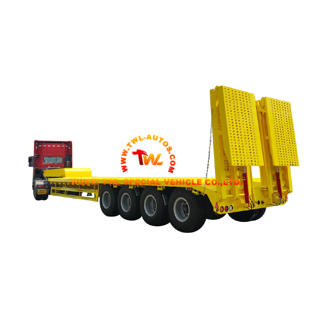 | Lowbed Trailer | Heavy machinery transport | Very low deck height, strong chassis | 30–150T payload, hydraulic ramps, multi-axle | Excavators, cranes, mining machines |